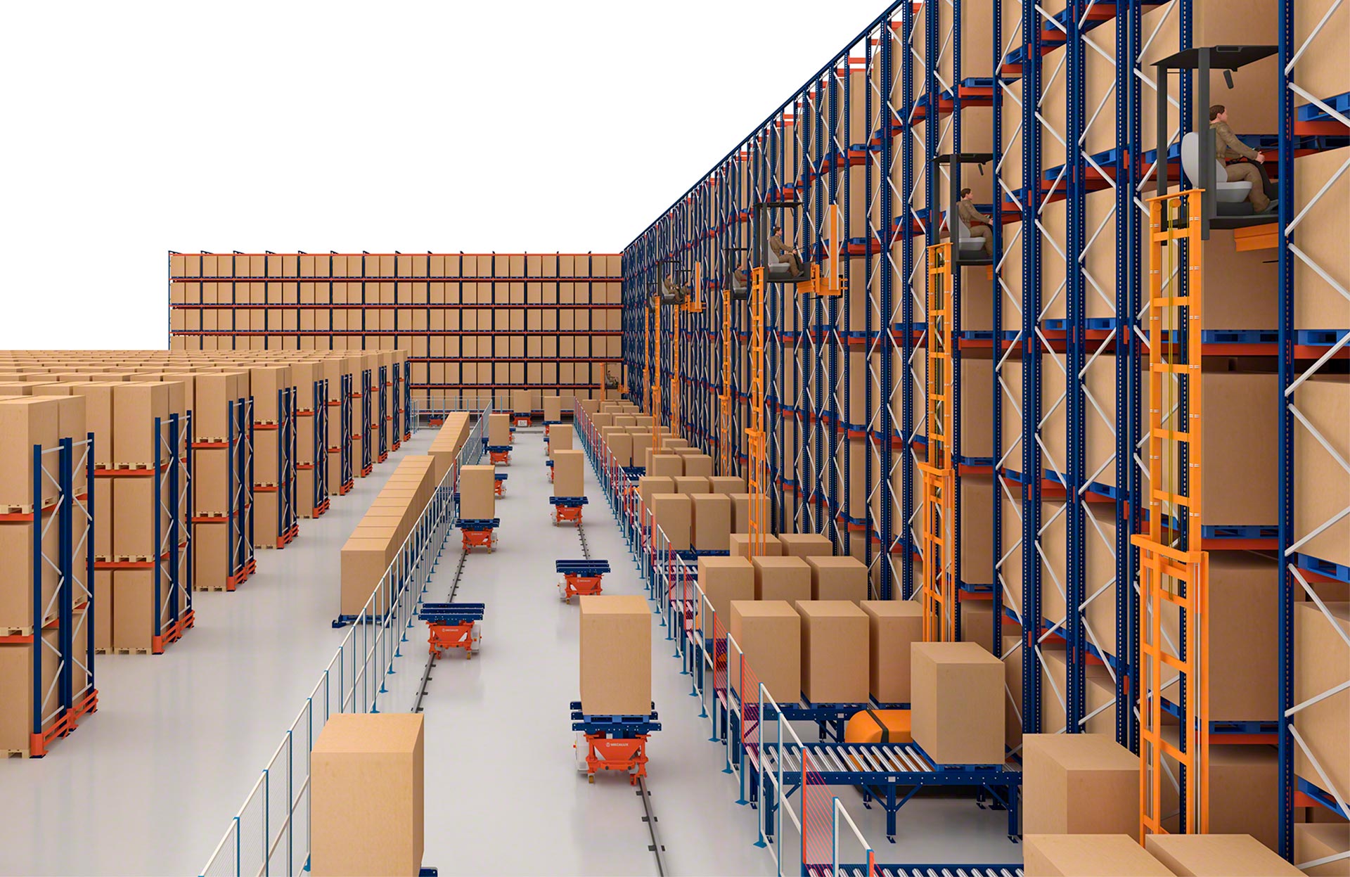 - Alta velocidad: los carros alcanzan velocidades de hasta 100 m/min con carga y 120 m/min sin carga, lo que confiere al sistema mayor rapidez frente a los transportadores y favorece la entrega de un flujo de palets/hora también superior.