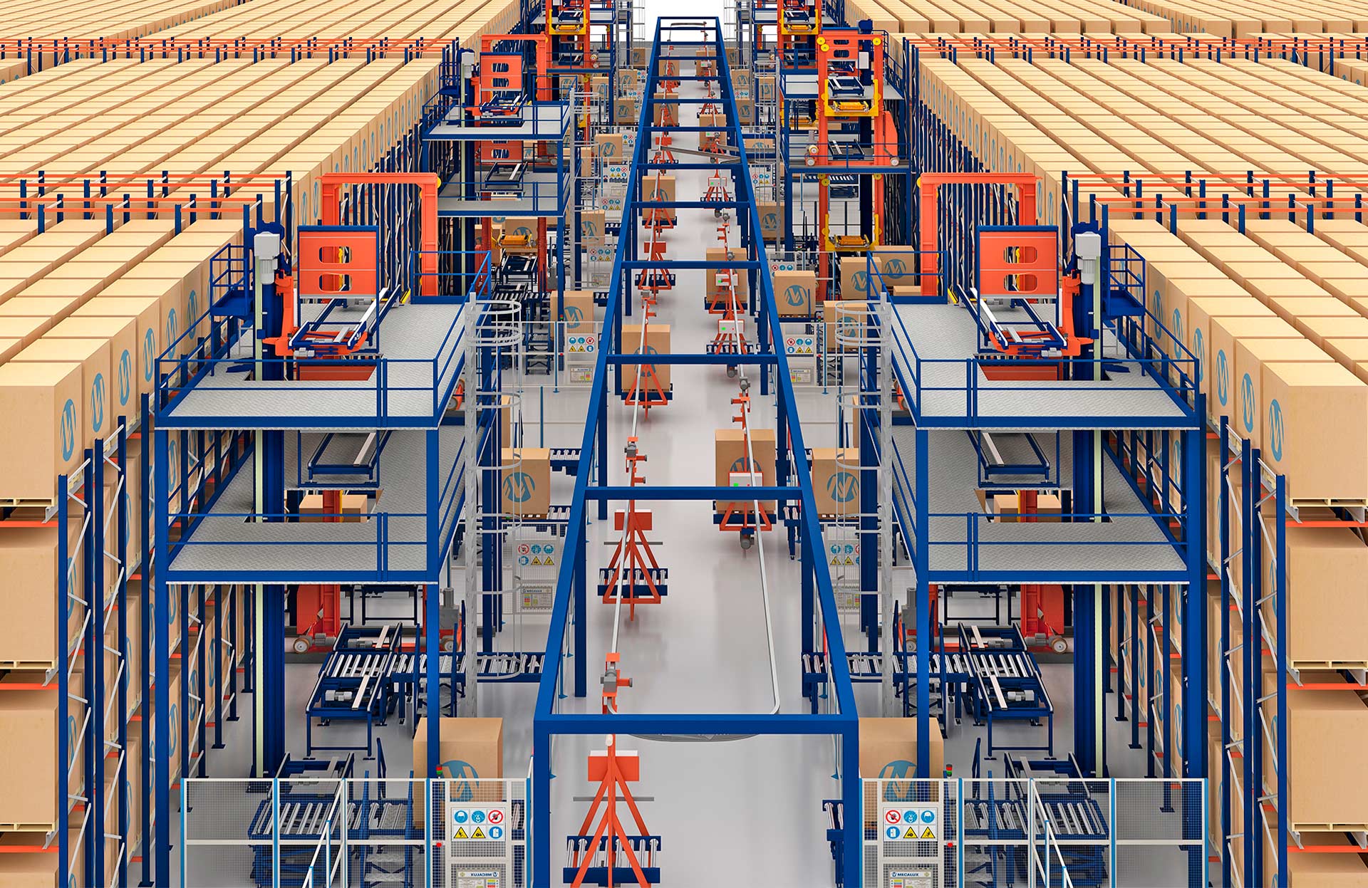 Guiados por un software que regula el tráfico y les asigna la ruta más adecuada, los carros se mueven por el circuito para transferir palets entre diferentes puntos de carga y descarga. Gracias a su velocidad, las electrovías de Mecalux dinamizan al máximo la circulación de mercancías en todo tipo de almacenes y centros productivos.