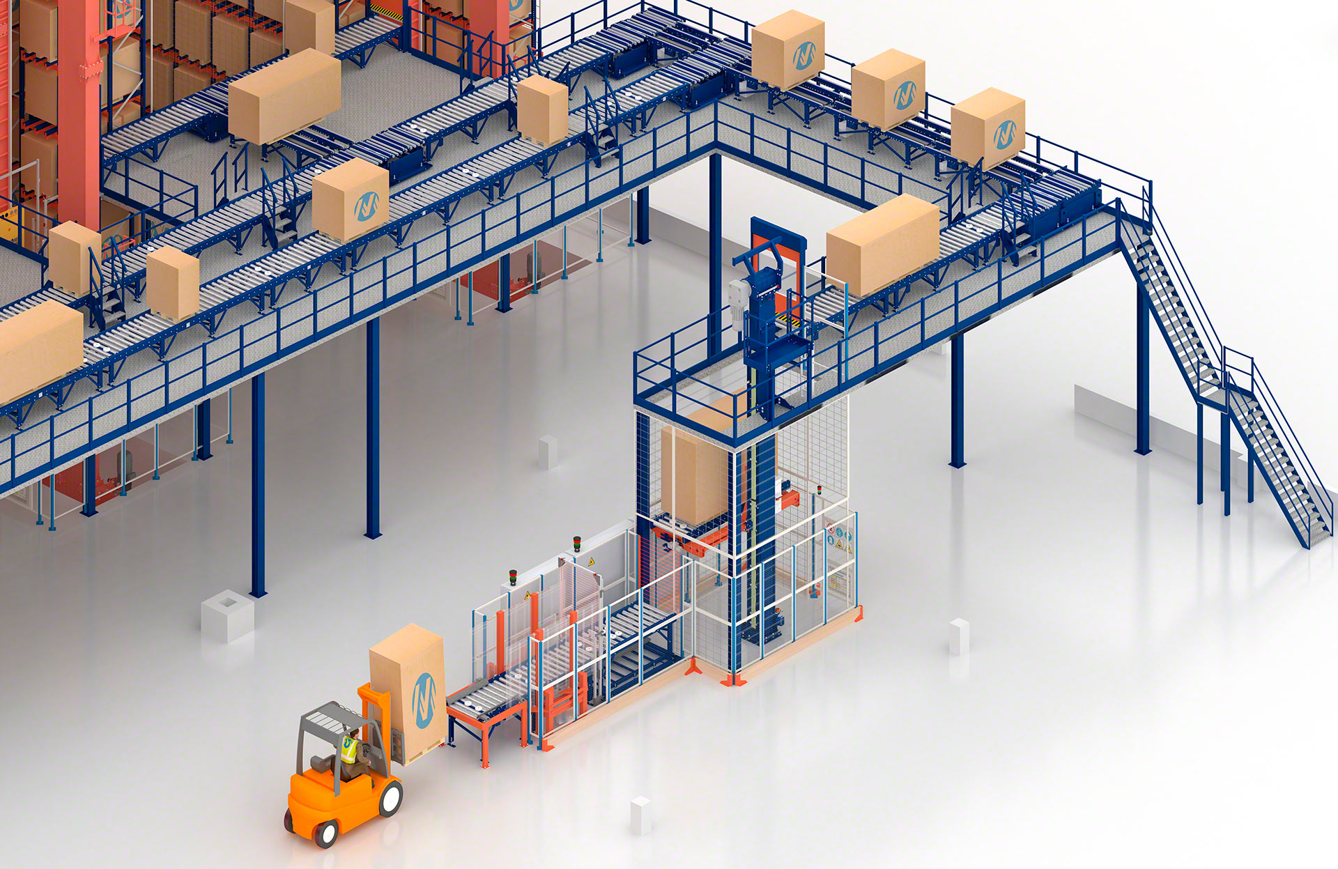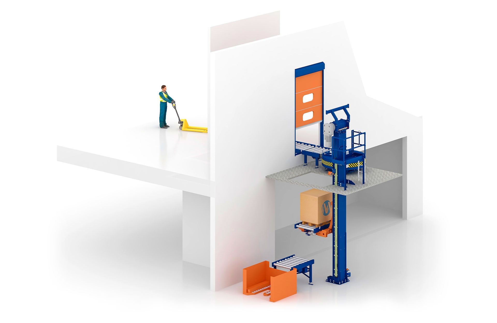 Sistema de transporte vertical que automatiza el ascenso y descenso de palets para salvar alturas y dinamizar el flujo interno de mercancías.
