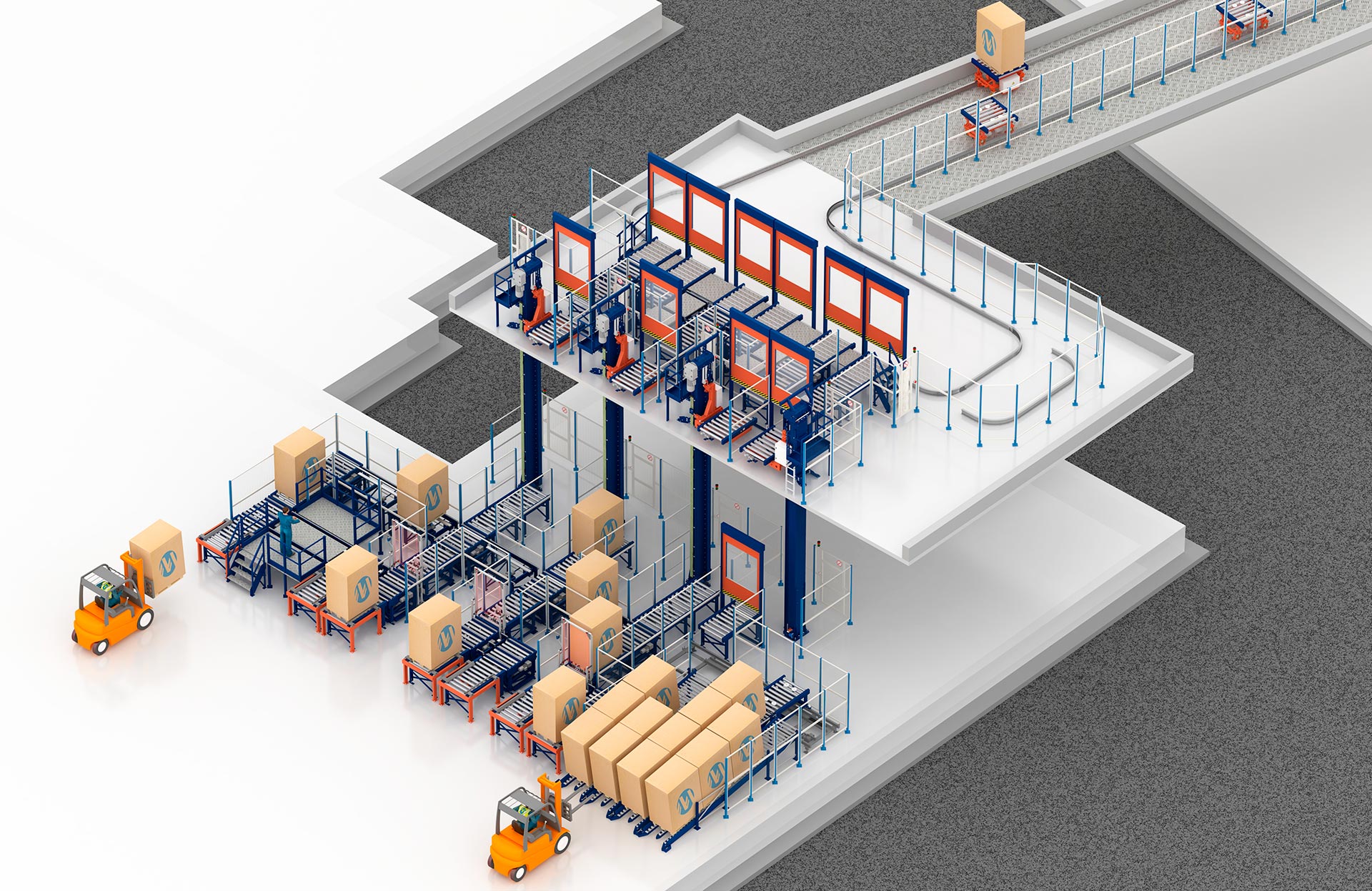 Generalmente, en los sistemas de almacenamiento automático que requieren del uso de elevadores de palets, como el Pallet Shuttle con lanzaderas y el Pallet Shuttle 3D, se instalan dos elevadores, uno de entrada y otro de salida. Sin embargo, si la instalación exige aumentar el volumen de ciclos/hora, es posible incrementar el número de elevadores e instalar dos de entrada y dos de salida.