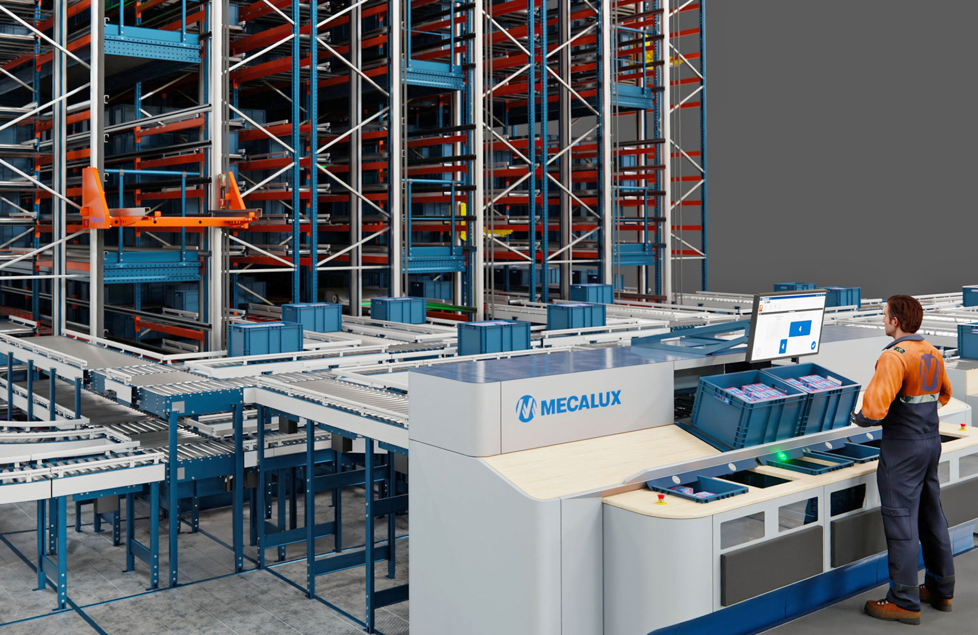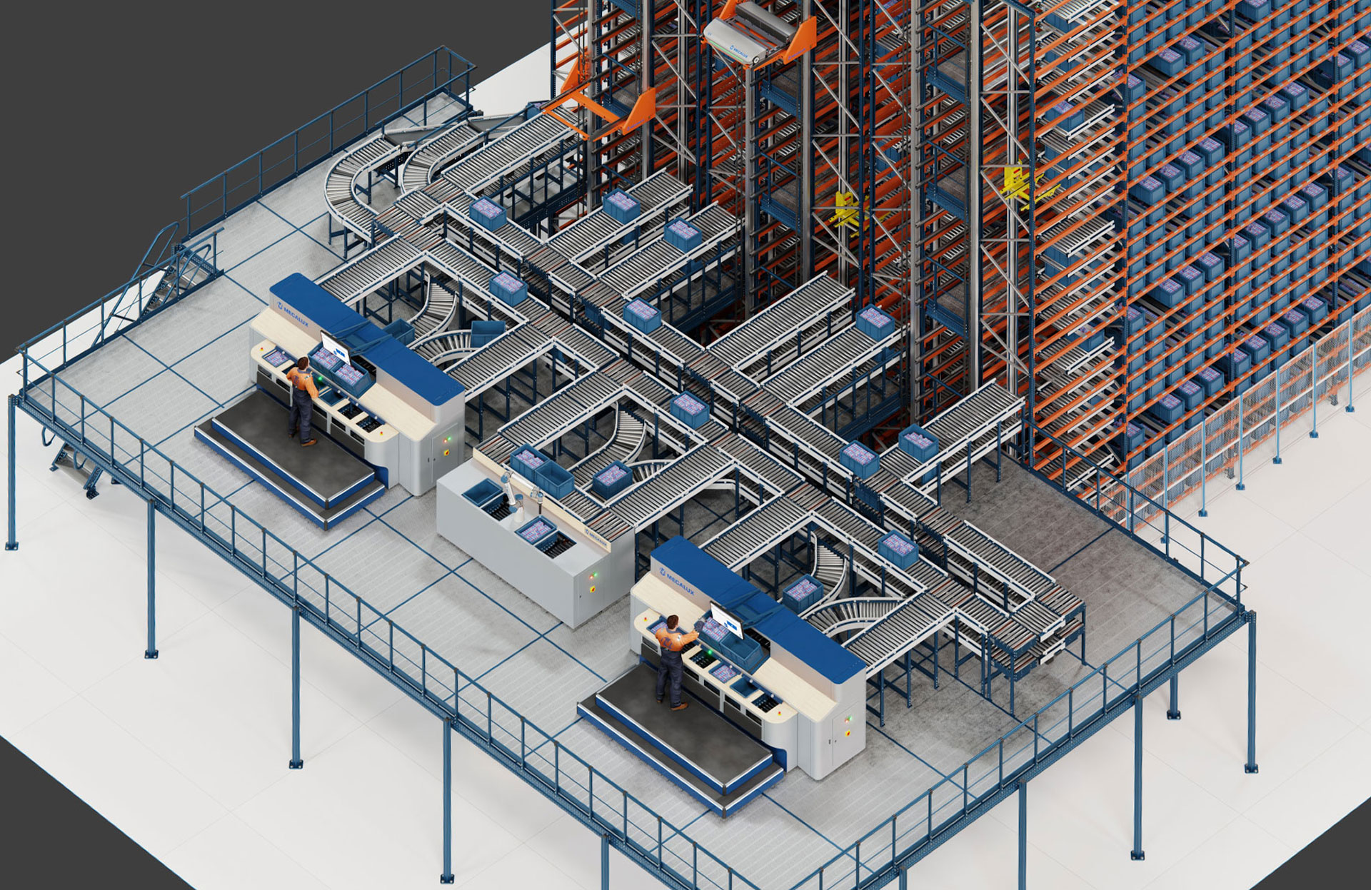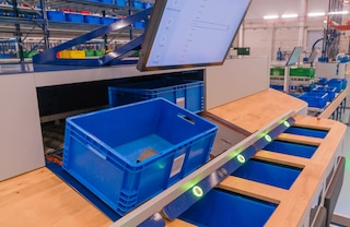 La preparación de pedidos se efectúa según el criterio “producto a persona”, el método por excelencia en almacenes automáticos. Los operarios aguardan en la estación de picking de alto rendimiento la mercancía que precisan para preparar los pedidos. El sistema trabaja con “pick-to-tote”: al preparar los pedidos directamente en las cajas que conforman cada uno de ellos, se agiliza su consolidación.