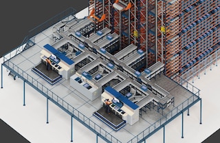 - Recepción de mercancías según el criterio “producto a persona”: las cajas o contenedores con los artículos necesarios para preparar pedidos se reciben de modo automático (alcanzando velocidades de hasta 40 m/min), evitando desplazamientos de operarios por el almacén.
