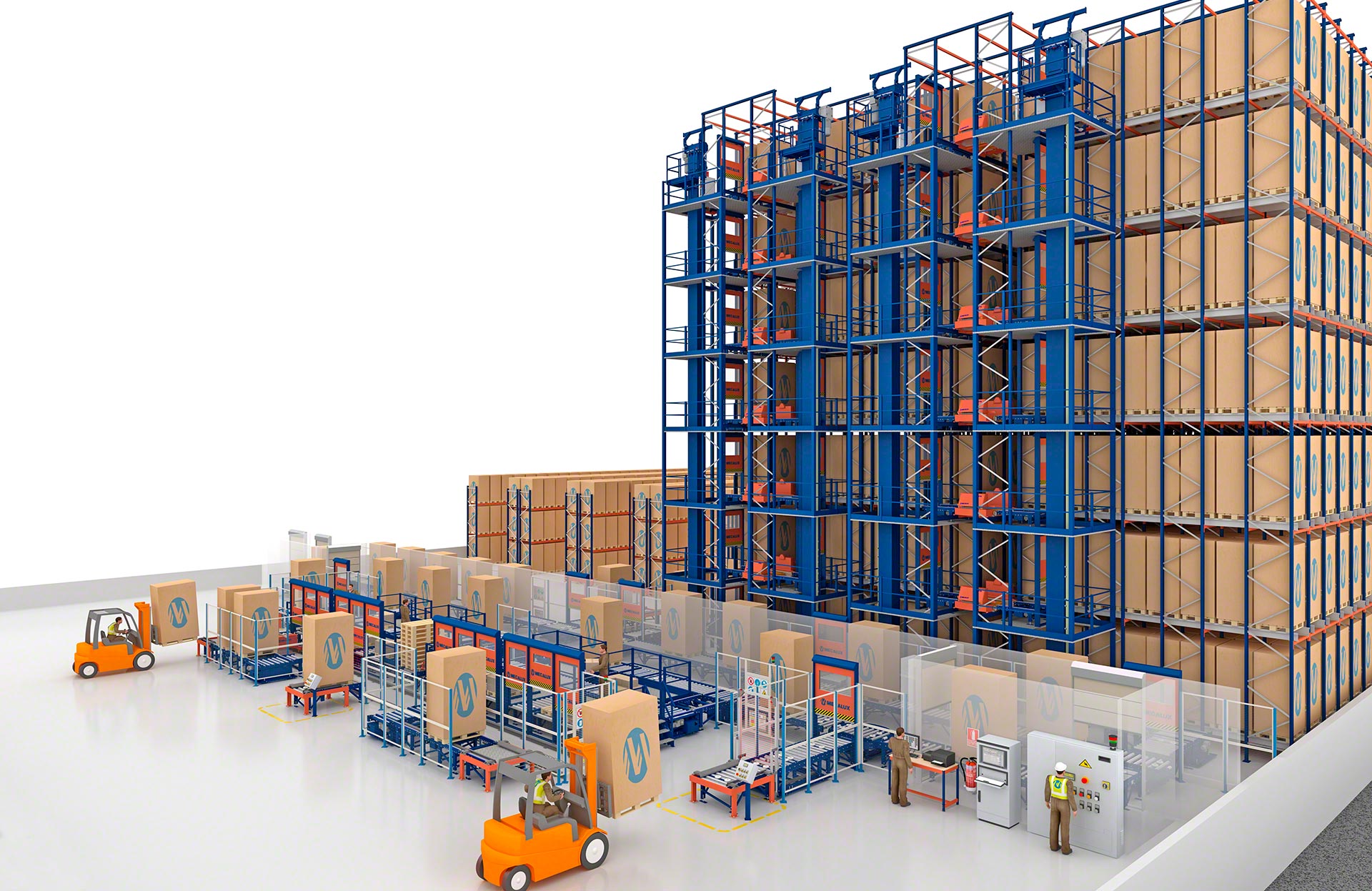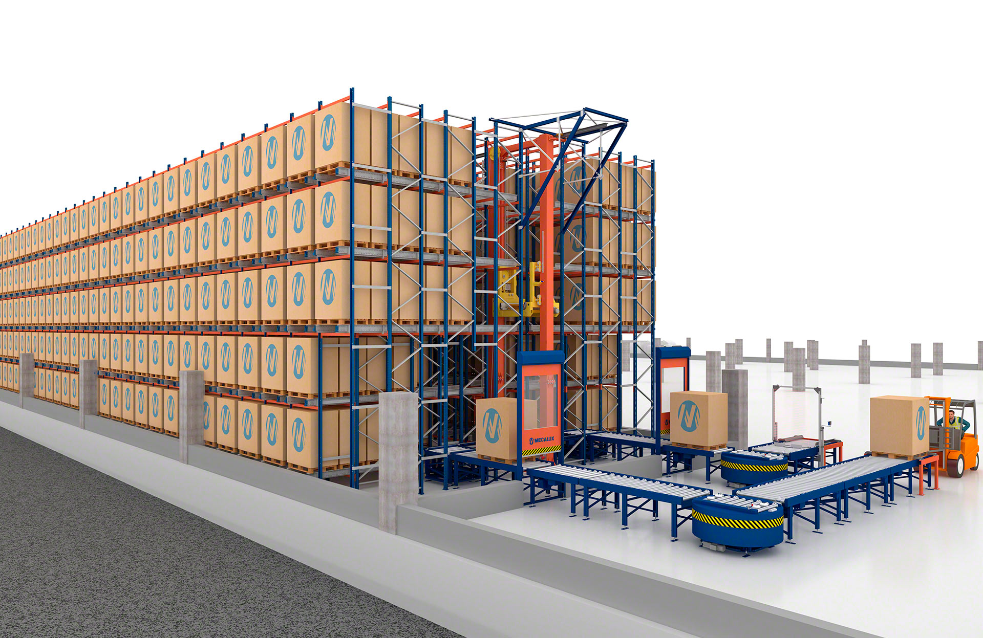 - Solución integral: Mecalux diseña, fabrica, instala y pone en marcha todos los componentes del sistema, desde las estanterías, el carro y los equipos de manutención automáticos (transelevadores o lanzaderas), hasta los transportadores, el software de control y el software de gestión.
