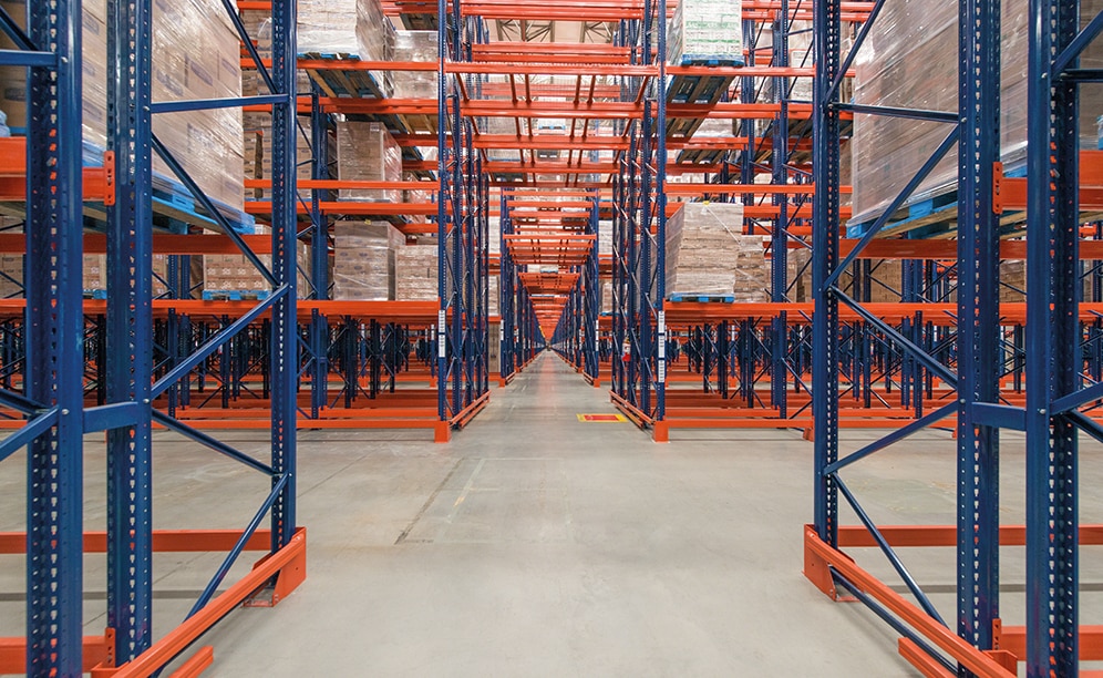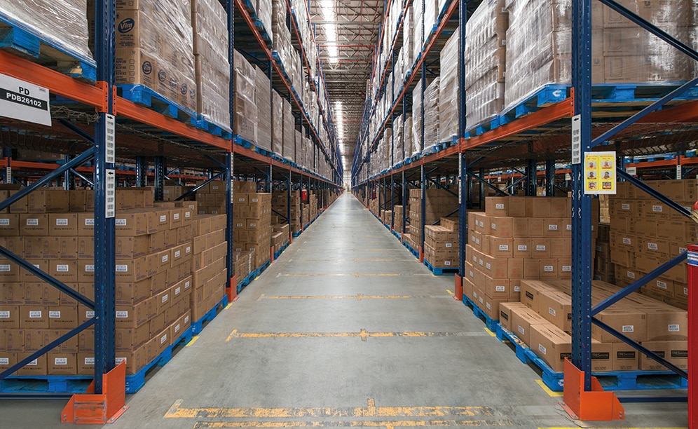 Mecalux ha suministrado estanterías de paletización convencional de simple y doble profundidad de 11,4 m de altura, con cinco o seis niveles, y 152 m de longitud. En total, presentan una capacidad de almacenaje para 83.569 palets de 1.000 x 1.200 mm.