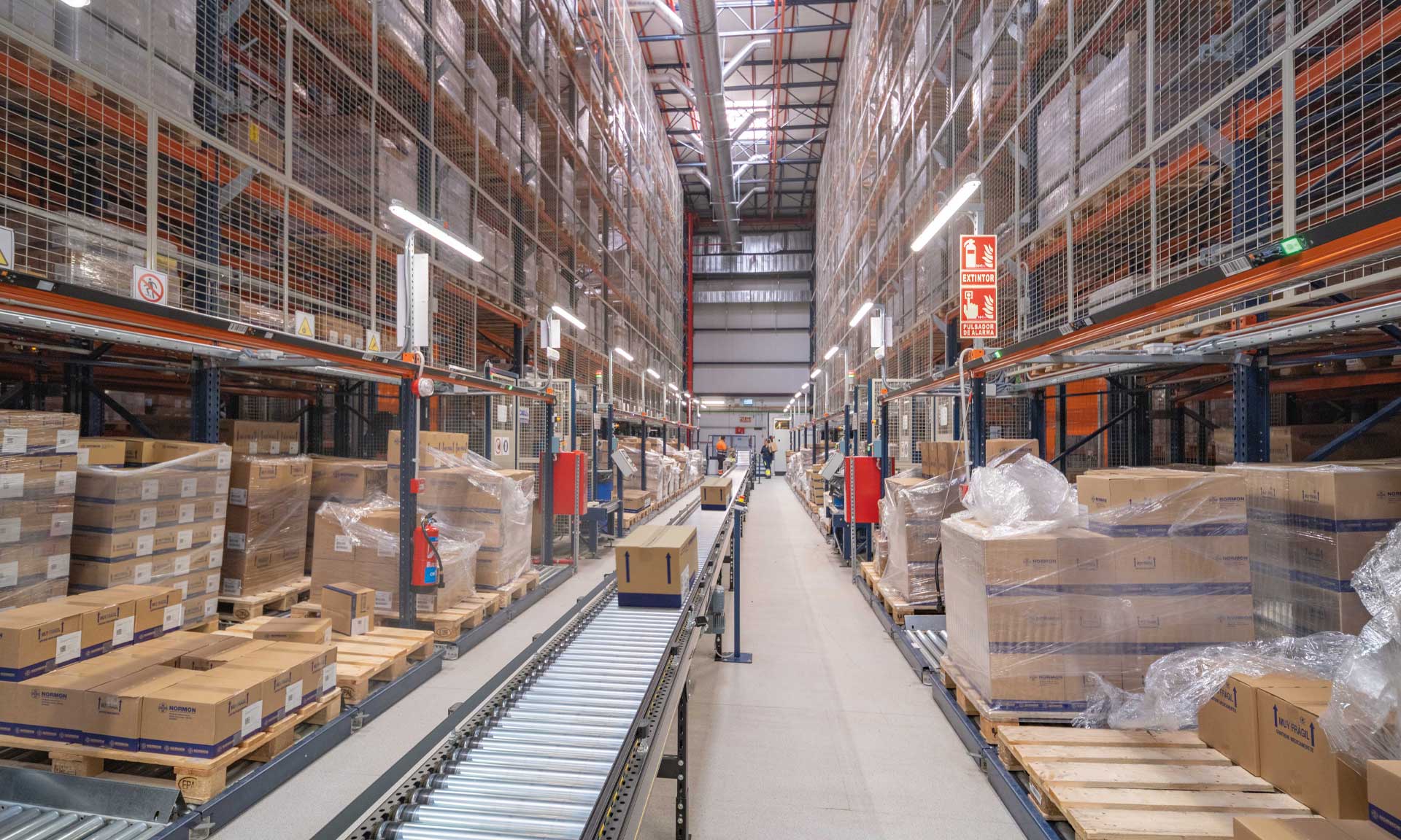 En las instalaciones automatizadas de Normon, la tecnología es el eje que garantiza una logística fluida, segura y adaptable a la demanda. El sistema de control desarrollado por Mecalux coordina el funcionamiento de todos los equipos robotizados, como transelevadores, carros motorizados o plataformas de carga, y gestiona hasta 6.900 movimientos de cajas por hora.