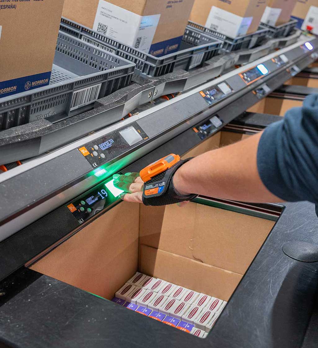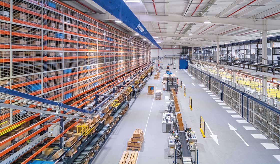 A continuación, las cajas se clasifican en un circuito de transportadores que se divide en tres ramales (clasificador tipo sorter) y descienden hasta la zona de expediciones en la planta inferior. Allí, con la ayuda de terminales de radiofrecuencia, los operarios recogen las cajas a medida que estas se deslizan por las 140 estanterías para picking dinámico y las colocan en los palets que se enviarán a los clientes.