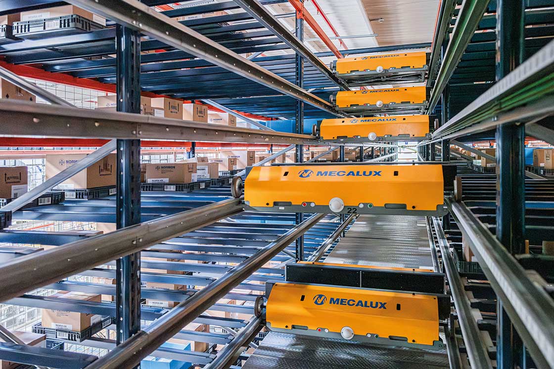 El Sistema Shuttle en Normon es una solución de almacenaje diseñada para picking masivo: incluye 46 lanzaderas que manipulan cajas en estanterías de triple profundidad con capacidad para 22.000 unidades. Las cajas, almacenadas sobre bandejas de 400 x 400 mm, son gestionadas de forma totalmente automatizada. Esta tecnología permite a los operarios centrarse en la preparación de pedidos mientras el sistema realiza las reposiciones.
