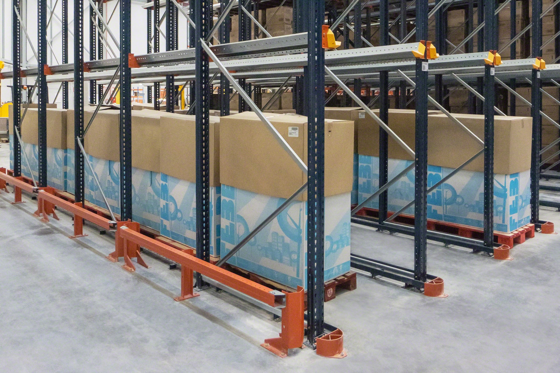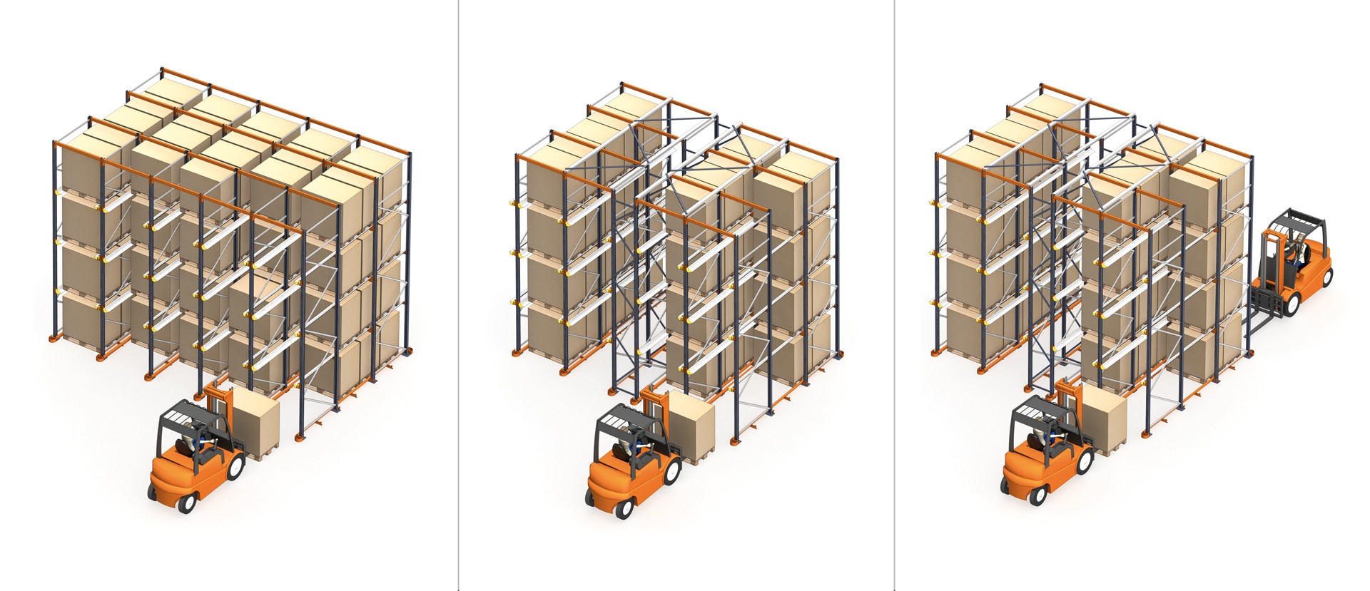 Estas estanterías pueden asumir dos configuraciones: drive-in (los palets se cargan y descargan desde un mismo pasillo de trabajo) o drive-through (los palets se cargan por un pasillo frontal y se descargan por otro trasero).