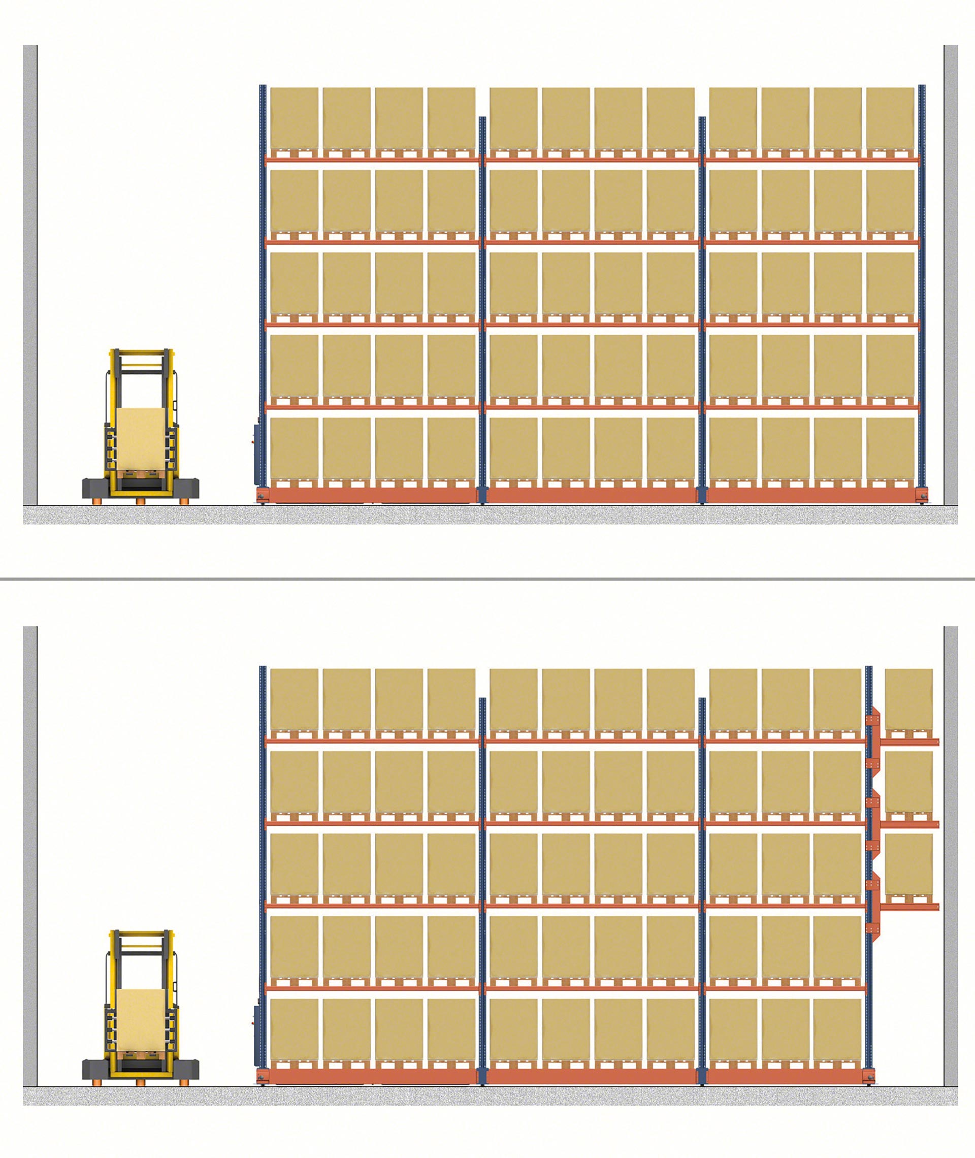 Se trata de una decisión que debe tomarse en la fase de diseño. Evidentemente, la máxima compactación se consigue con la configuración que permite la apertura de un único pasillo de trabajo para la operación con carretillas. No obstante, si el cliente lo requiere puede habilitarse la apertura simultánea de más de un pasillo de trabajo, aunque a costa de reducir el número de bases móviles y, en consecuencia, la capacidad de almacenaje.