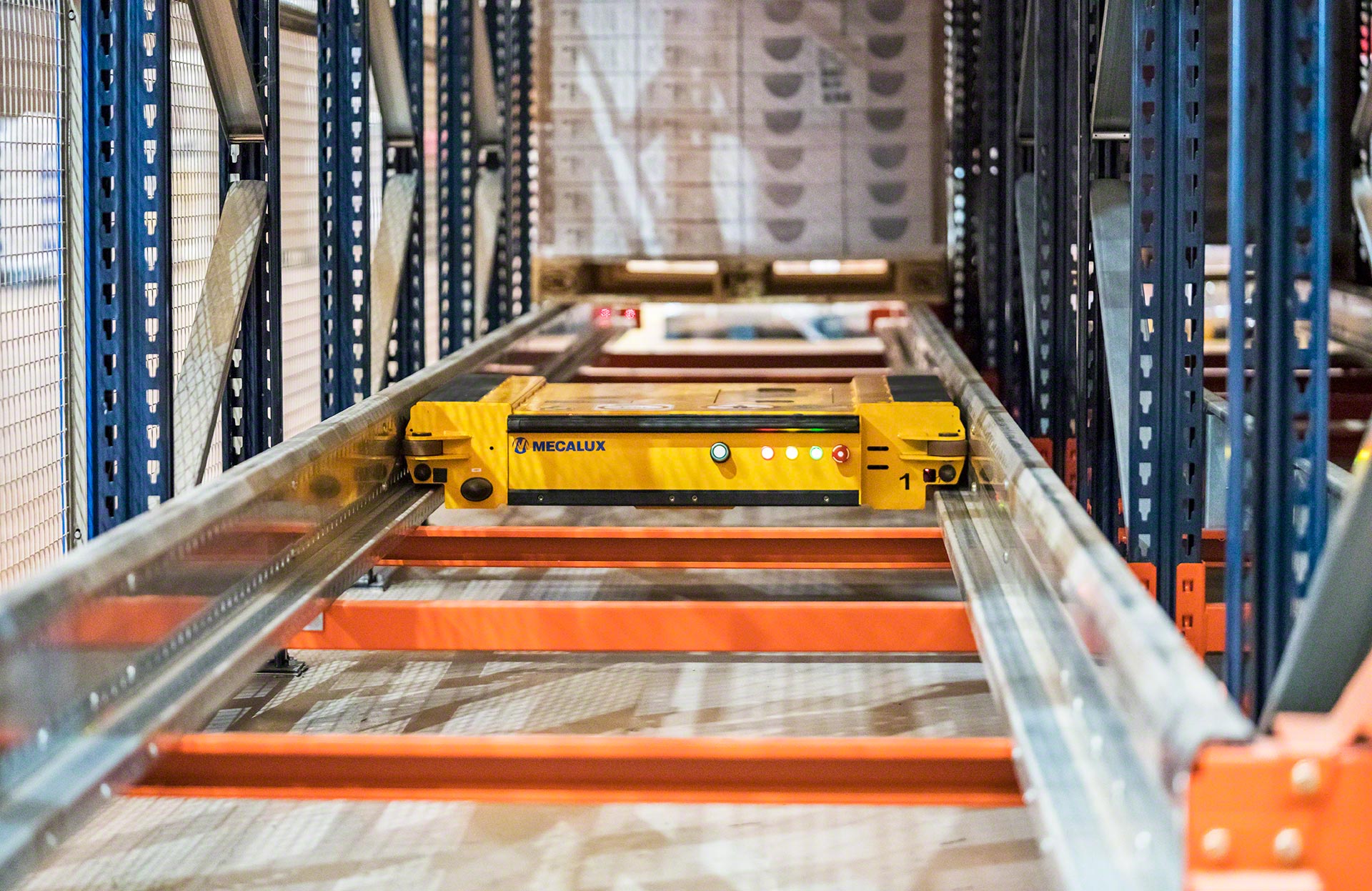 No obstante, Mecalux ofrece también una alternativa completamente automatizada, el Pallet Shuttle automático. Se trata de una solución en la que la carretilla es sustituida por un transelevador o un conjunto de lanzaderas que transportan el carro y el palet desde las posiciones de entrada hasta cada canal de almacenaje, de forma completamente autónoma. Además, en este sistema el gobierno de todas las operativas recae directamente en un software de control.