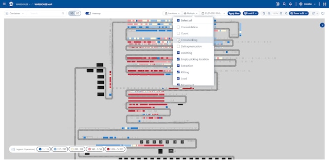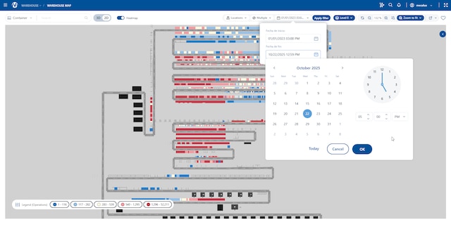 A través del mapa de calor, el usuario puede aplicar distintos filtros sobre el plano del almacén para consultar el nivel de utilización de cada área según el tipo de operación (picking, reposición, expediciones, etc.). De este modo, la herramienta identifica fácil e intuitivamente las zonas calientes—es decir, las que concentran mayor actividad— y las zonas frías del almacén.