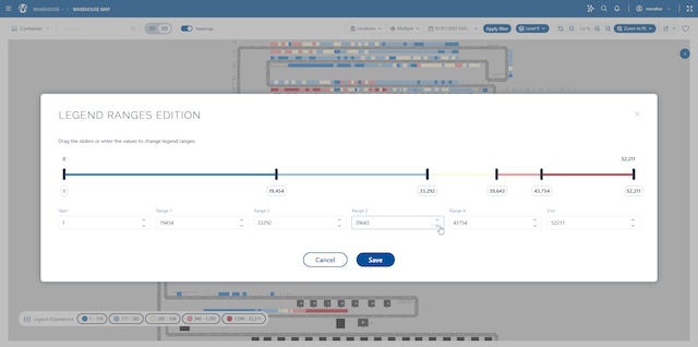 La información se presenta en un mapa completamente interactivo, desde el que se pueden recorrer los distintos niveles del almacén y obtener el detalle por proceso de cada zona. Asimismo, el usuario puede ajustar los rangos de calor para adaptar su análisis a cada necesidad. Por último, es posible exportar los resultados del mapa de calor tanto en formato imagen como en un informe descargable.
